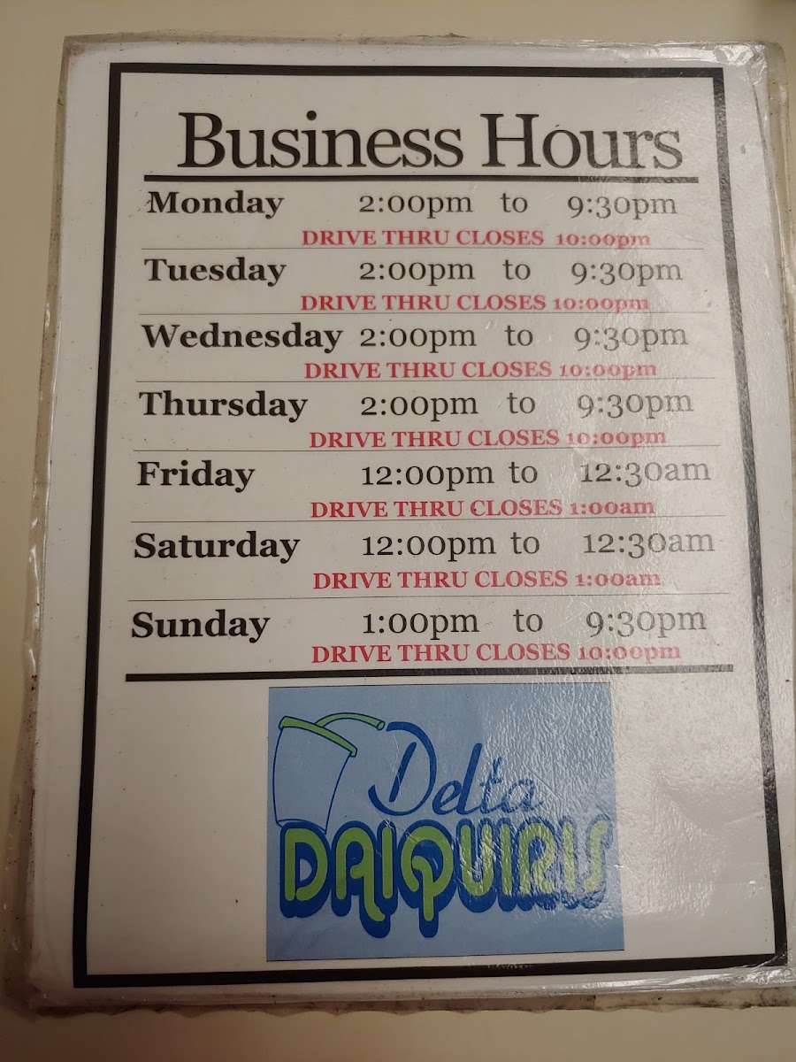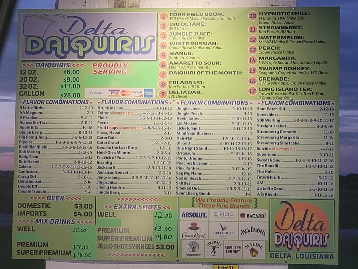 The Delta Daiquiris Menu offers a laid-back vibe perfect for unwinding with a refreshing drink. Located right off I-20 at EXIT 186 in Delta, LA, this spot serves up a variety of daiquiris, each crafted to perfection. Whether you’re in the mood for something fruity, tangy, or a little more daring, you’ll find a drink that hits the spot. Beyond daiquiris, the menu features a selection of tasty appetizers and hearty meals that pair perfectly with your drink of choice. It’s the ideal place to stop and grab a bite, enjoy great company, and savor the flavors of the Delta. If you’re ever in the area, make sure to check out what’s on offer - it’s a local favorite for good reason!